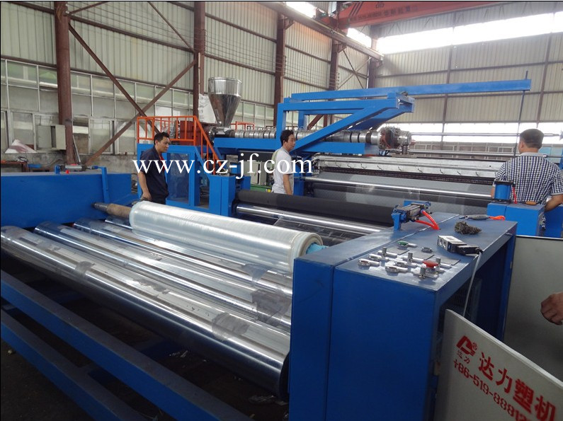 The extruding machine adopts charging barrel and charging bar with large caliber and large length-diameter ratio of 65-160/28: 1-33: 1, internal die cavity, as well as T+S structure advanced in the world. The raw fabrics and finished fabrics are wound and rewound in double station automatic crank turn-over mechanism. The machine adopts pneumatic roll changing mode and the rewinding tension can be regulated mechanically for facilitating maintenance. The fabric is wound by a moment motor with auto control device.