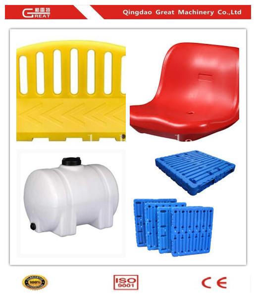 Our water tank blow molding machine capacity are from 200L to 10,000Liter, which can produce water tanks, pallets, road barrier, IBC, dustbin, chairs, table top, tool box and other customized products.