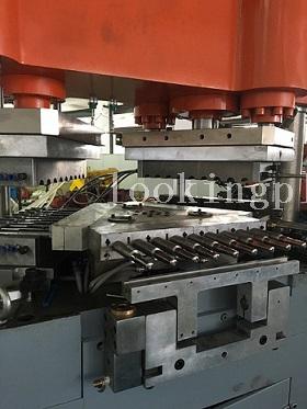 Blowing action was done at this part,molding would be complete after cooling.(bottle shape decides the number of cavity).The air came out from the mandrils huffs the cavity,making the cavity cling to the mold.Then the mold open and the mandrils turn to...along with bottles.