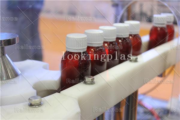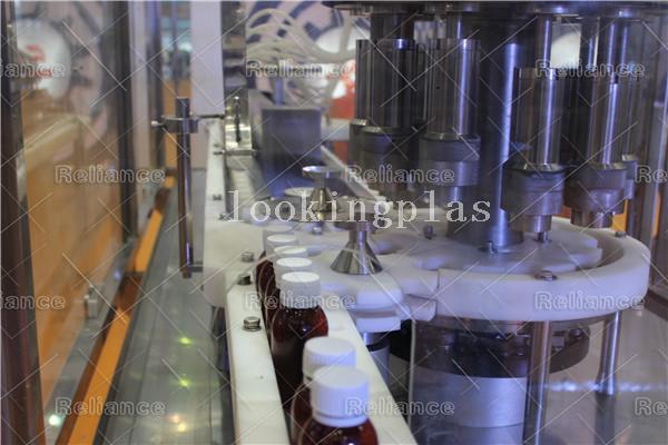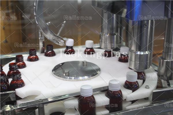 Prepare enough bottles and caps and liquid, put the bulk caps into the hopper, and bottle will coming in to the filling station by the turn table through the conveyor, each 8 bottles will get into the filling station, after filling will get into the cap fitting and sealing station. 8 filling nuzzles will get down get into the bottle and filling inside to finish one time filling .