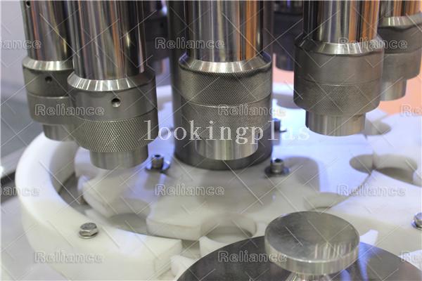 This filling machine including operating table, frame, capping head, hopper, track for cap, dosing pump, conveyor, star wheel and so on.