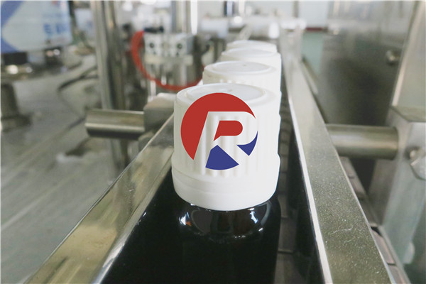 Bottle feed-in -- 4 nozzles Filling station -- plug inserting -- Capping -- Finished