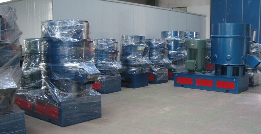 When the waste plastic is supplied into the chamber of such machine, it will be cut into smaller chips due to the crushing function of the rotating knife and fixed knife. During the crushing processing, the material that soaked up lots heat from the frictional movement of material being crushing and the wall of container will be going to become semi-plasticizing state. The particles will stick with each other due to the function of plasticization. Before it sticks each other completely, the cold water pre-prepared is sprayed into the material being crushed. The water will be evaporated off quickly and the surface temperature of material being crushed drop down quickly also. So the material being crushed will become small particles or granules. It is easy to recognize the particles by different size and can be colored by using of color agent being putted into the container during the crushing processing.