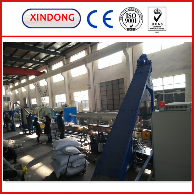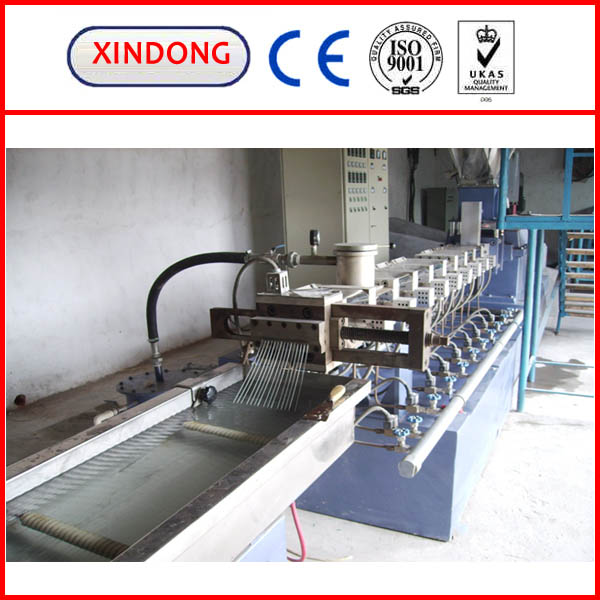 This machine is used to extrude plastic cleaned by high temperature. The extrusion line can be consisted by such accessory machine: Main motor, the gear box, the distribution box, the barrel and screw, the dies, vacuum calibration tank. Main Motor is mainly to supply the power. The Gear box transfers the motor to power. The distribution box enlarges the strength of the power and realizes uniformity. Double screws can make low viscosity index consume of raw material and improve production. It also has a Cooling tank making the heat of screw be appropriate.