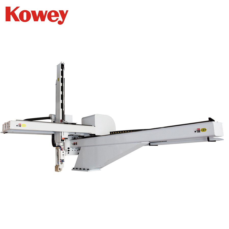 Kowey series traversing robot arm is applicable to all types of horizontal injection machine ranges of 80T-320T for take-out products and sprues. Vertical arm is telescopic type, with product arm and runner arm, for two plate or three plate mold products take out. Traverse axis driven by AC servo motor. After installed this robot, the productivity will be increased 10-30%, reduce defective rate, ensure safety of operators, reduce manpower and accurately control the output to reduce waste.