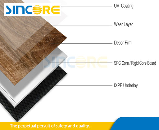 SPC base + decorative layer + wear-resisting layer is extruded online by one step method, and then UV layer is added to increase its wear-resisting coefficient and finish.