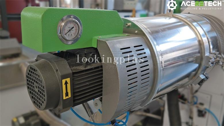 The rotary blades at the bottom of the compactor and fixed blades on the wall cut plastic material into small flakes. Friction heat dries and pre-heats the flakes and makes them shrink. Arc-shaped plates guide the material down to be cut. Shrunken flakes are fed into the extruder under the centrifugal force of knife disk.
