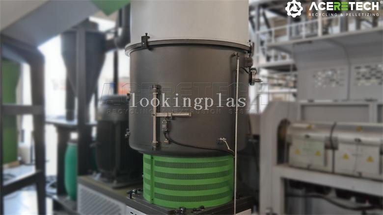 The rotary blades at the bottom of the compactor and fixed blades on the wall cut plastic material into small flakes. Friction heat dries and pre-heats the flakes and makes them shrink. Arc-shaped plates guide the material down to be cut. Shrunken flakes are fed into the extruder under the centrifugal force of knife disk.
