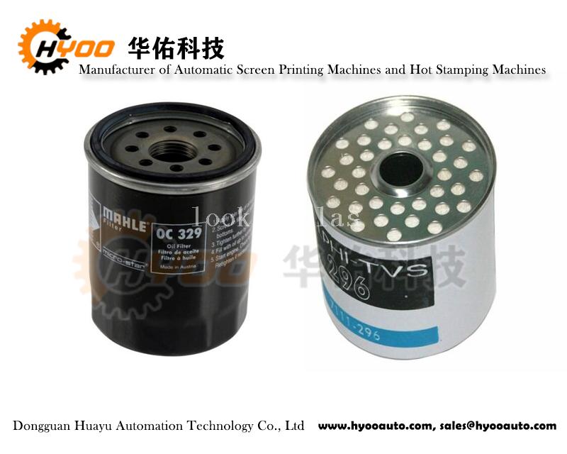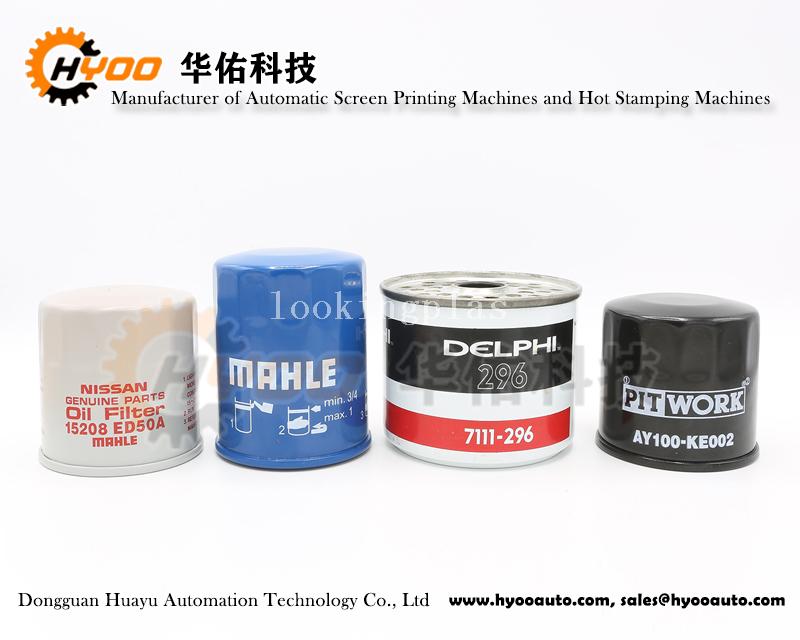 Above Huayu Automation High Precision Fully Automatic Screen Printing Machine HY-R45 can print various Oil Filter, Engine Oil Filter, Air Filter, Fuel Filter, Electric Fuel Pump etc., like Fleetguard Oil Filter, Acoelco Oil Filter, Duraguard Oil Filter, Mahle Oil Filter, Delphi Oil Filter, NISSAN Oil Filter, PITWORK Air Filter... widely match the print requirements of Automotive Oil industries.