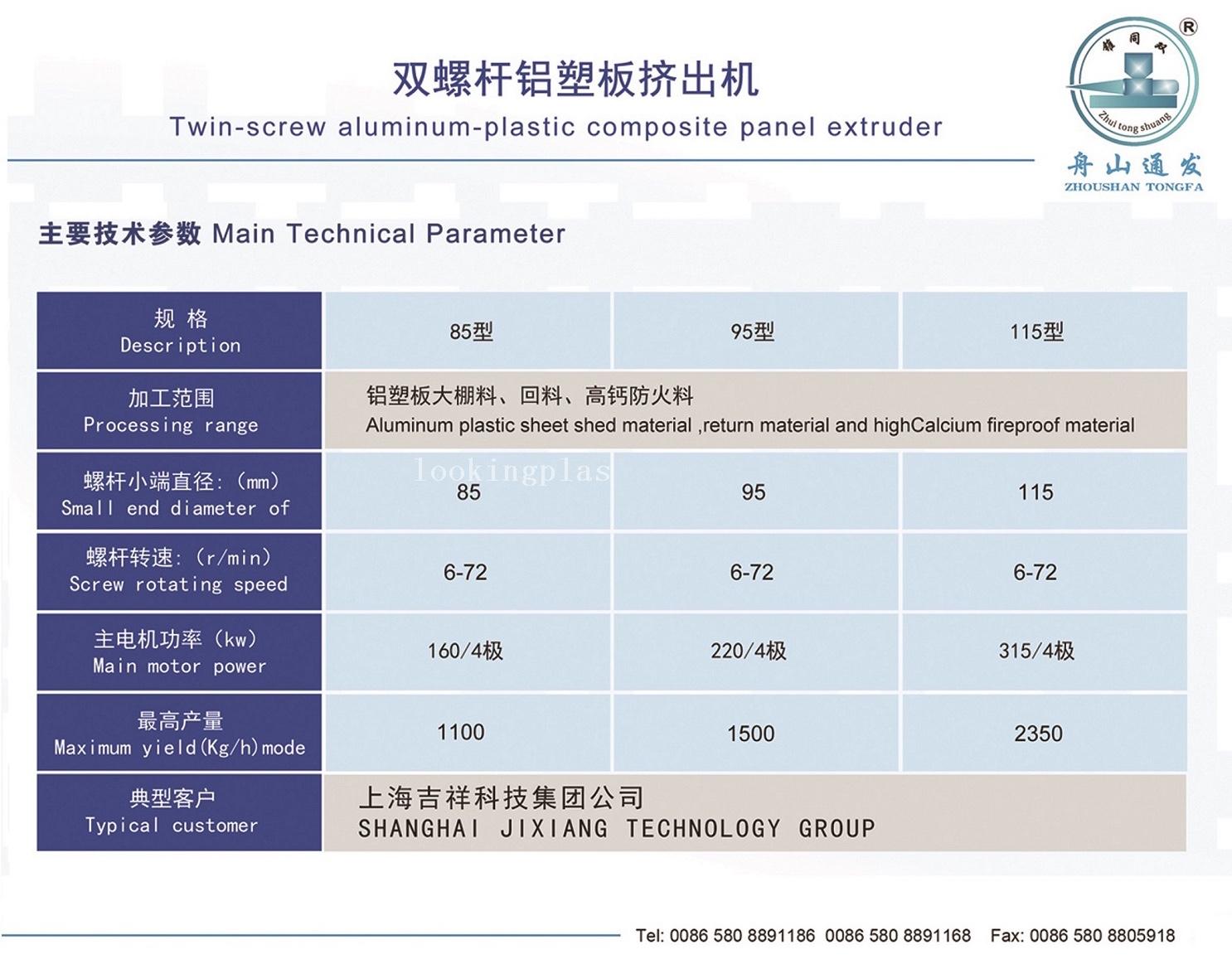 The developed twin-screw aluminum composite panel extruder uses the technology of conical co-rotating twin screw extrusion, which have both advantage of big extrusion pressure of conical counter-rotating twin screw extruder and good plasticization of parallel co-rotating twin screw extruder, in addition, it has stable extrusion pressure of single screw extruder, saving energy obviously, and will become the best equipment to make aluminum composite panel.