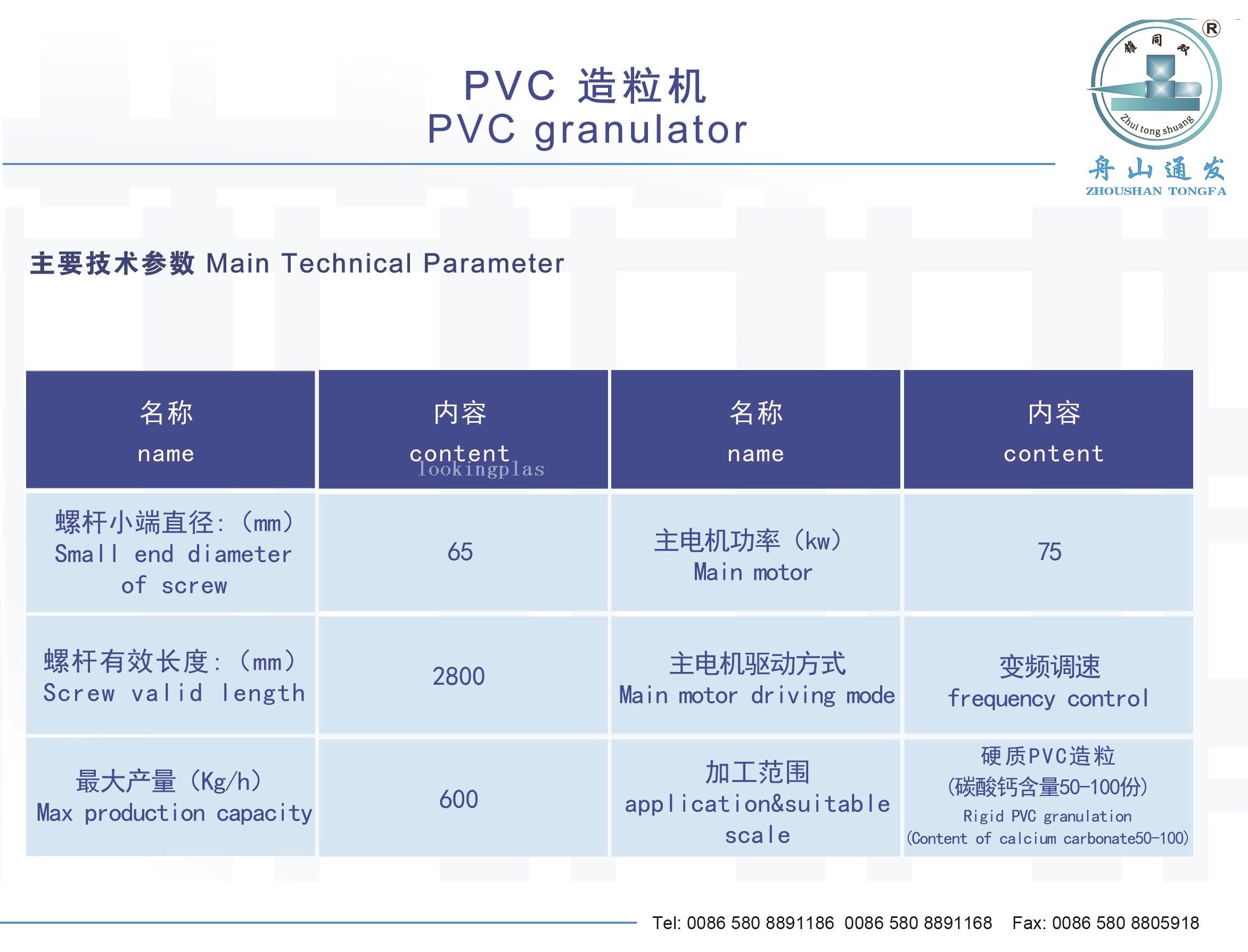 Conical co-rotating twin-screw PVC granulator has many superiorities , such as high yield(10 to 20 tons/day),ultra-low power consumption(75 kilowatts hour of lowest electricity consumption for 1 ton of finished product),good mixing plastics(high-pressure plasticization),and can add high proportion of calcium carbonate to the materials(up to 400),and also can be reproduced for 100% reclaimed material with full exhaust and high pressure. It is the best choice for all kinds of soft PVC,rigid PVC,transparent PVC, forming PVC,CPVC and other materials’ granulation.