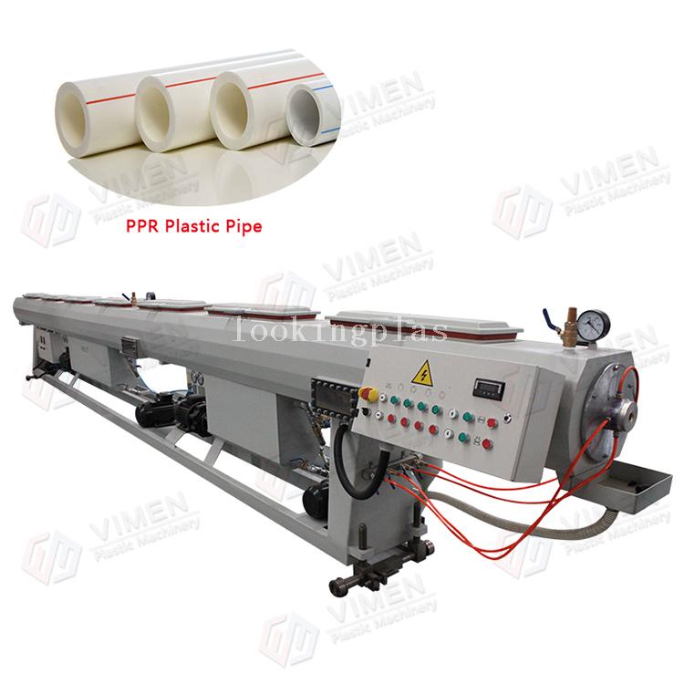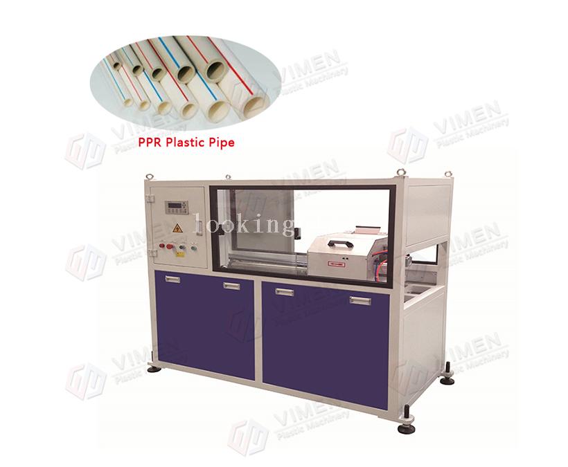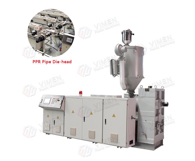 PPR pipe production line equipment mainly by: Single screw extruder, Die head, Vacuum calibration tank, Spray cooling tank, Haul-off, Chipless cutter, Stacker, Hopper dryer, Vacuum feeder, gravimetric control system.