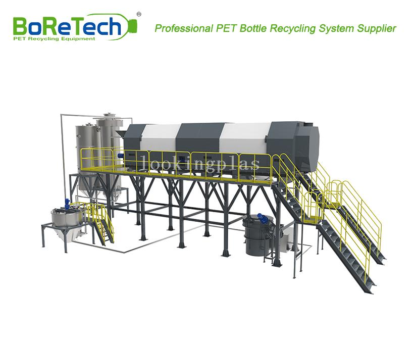 BoReTech supplys two types of PET bottle pre-washing machines, one is continuous bottle pre-washing machine, the other one is batch pre-washing machine. The biggest feature of continuous bottle pre-washer is the automated water circulation system, continuous feeding and washing, then uses the high-temperature chemical water to remove the labels, dirt, sands, glues, rubbers, metal and other impurities on the bottles' surfaces. Separating rate will more than 90%. The supporting chemical water filtration system can attain the chemical water reuse, and prolong the service life of the chemical water and save the washing costs. Intermittent washing ensures that there is sufficient soak time for the bottles in the chemical water, it will be applied to the recycling of oil bottles well.
