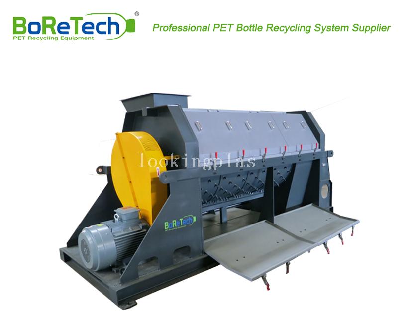 In Asia, most of labels made from PVC heat-shrinkage film which cannot be removed through bottle prewashing; this is another major problem in PET recycling industry. BoReTech patented label separation machine completely solved this problem. Firstly, label scrapper will tear the labels, so that the labels no longer attached to bottles, and then,the labels will completely separated by adjustable wind-force and gravity difference.