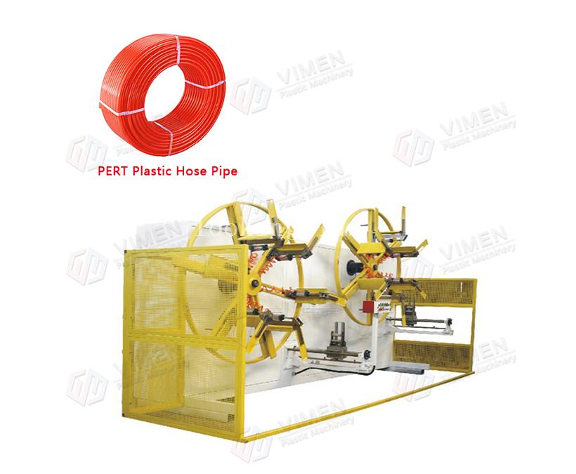 PERT plastic pipe extruder line equipment mainly by: Single screw extruder, Die head, Vacuum calibration tank, Spray cooling tank, Haul-off, Chipless cutter, Winder machine, Hopper dryer, Vacuum feeder, gravimetric control system.