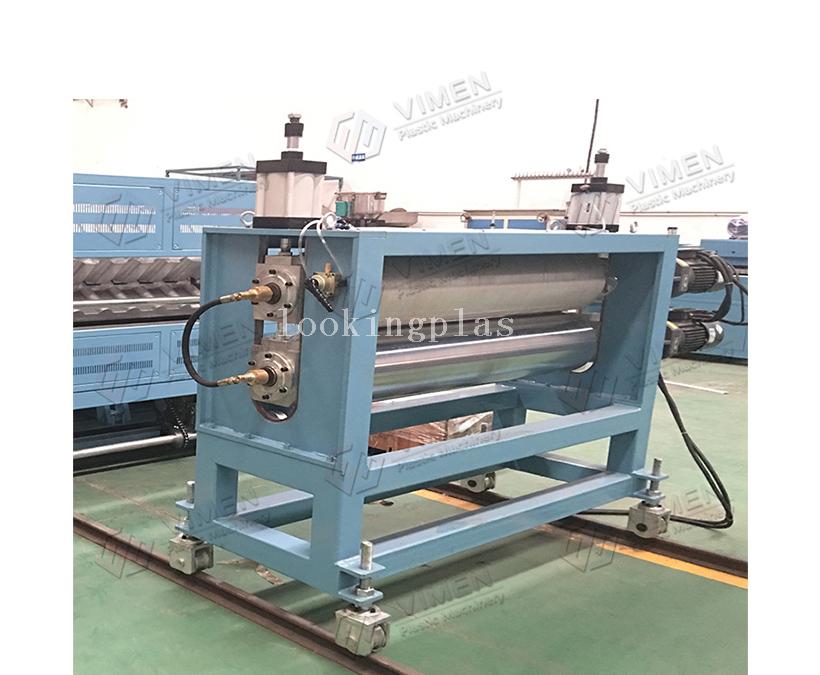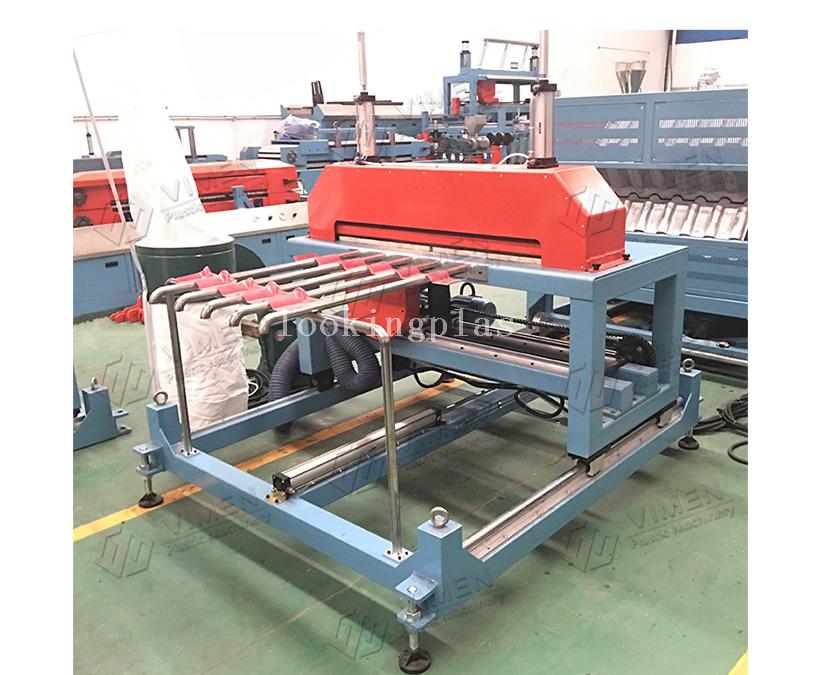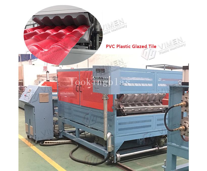 PVC plastic glazed roof tile extrusion line is mainly composed of: material conveying and mixing system, conical twin-screw extruder, single extruder, T-die, embossing roller, glaze tile calibration unit, cutter, stacker and other auxiliary equipment.