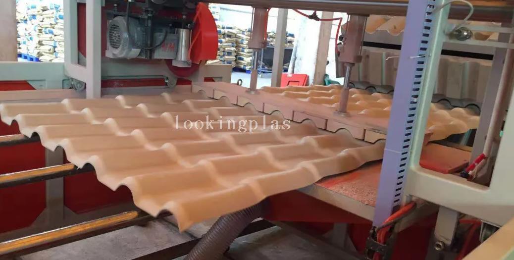 PVC+ASA Co-extrusion Hollow Roof Tile Production Line includes extruder, mould, calibration system, haul-off machine, cutting machine and stacker.