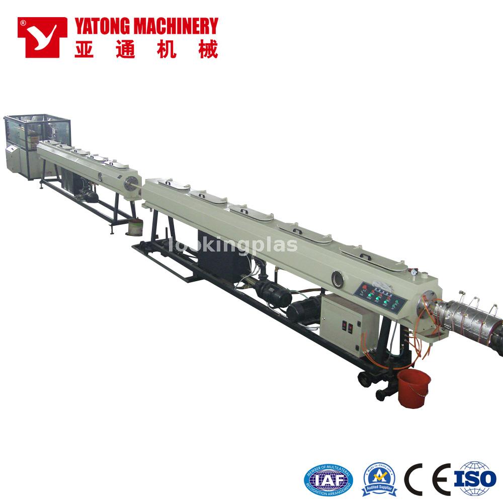 PE material Hopper Dryer → PE pipe extruder → marking line extruder → mould → calibrator → vacuum calibration tank → spray cooling water tank → printer → haul-off → cutter → pipe discharging rack