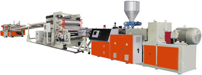 This production line consists of special twin screw extruder, mould, vertical installed 3-roller calendar, and auxiliary machines, our company will offer formulation and full sets of technology of the complete processes. The production line has the advantages of large output, stable extrusion, and high foamed ratio.The barrel and screws of extruder are specially designed for PVC and WPC foamed products extrusion, venting type design, the barrel and screws are bimetallic treatment, effectively reduce the big wearing problem caused by PVC and WPC materials, highly increases the service life of extruder. Adopting PLC people-machine interface computer control,Siemens LCD. The operation parameters can be customized and showed on the display. Material of mould is high quality alloy steel 5CrNiMo forging treatment, the surface of inner flow channel is under chrome plating treatment and polish treatment. The structure of mould adopts imported technology, the die cavity under hard chrome plating treatment and mirror type polishing treatment. The board thickness is easily regulated; mould lips are changeable, so when produce boards of different thickness only to regulate the bolts on mould lips is ok.