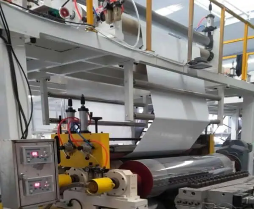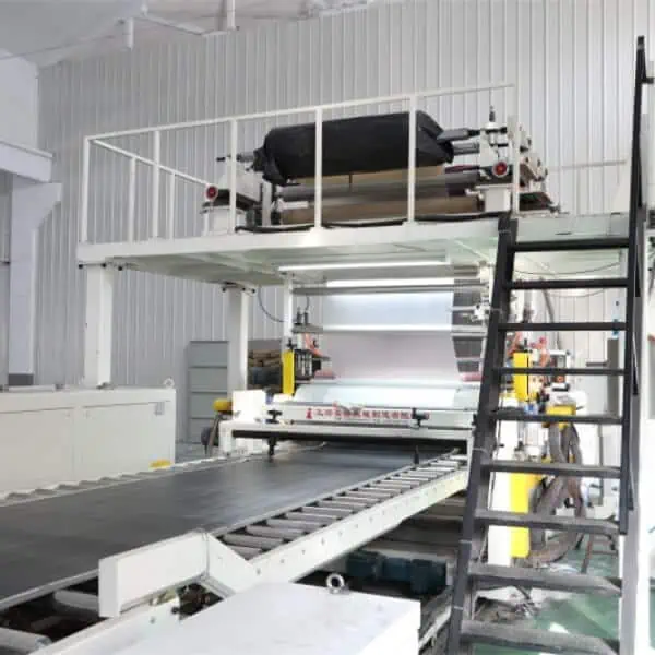 SPC flooring sheet extrusion line is made of PVC base material extruded by extruder, SPC core, PVC color film, PVC wear layer, UV layer are pressed and pasted in one time by five roller calender. The product is simple in process, pasted by heat and without glue.