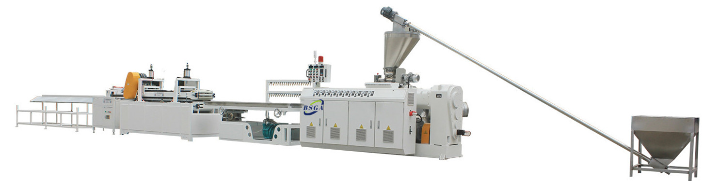 The unit is composed of conical twin-screw extruder, vacuum shaping table, hall-off machine, cutter, laminator, turning-up flame and others. According to the different profile’s section and moulds, you can choose different specifications of extruders to fit.