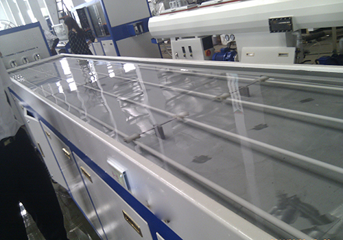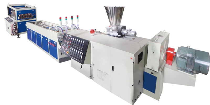 The whole line is composed of conical twin screw extruder of 65mm, four cavities PVC pipe extrusion mold, four cavity cooling calibration tank, four station haul off and cutting macine, four station stacker.