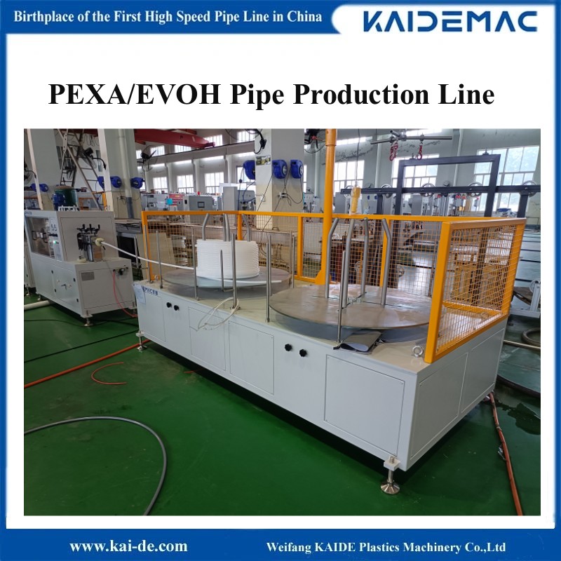 PEX-a/EVOH pipe is produced by 2 steps. First machine produced the PEX-a pipe out, the other machine coated the pex-a pipes with Glue and EVOH layer. KAIDE factory PEX-a/EVOH pipe making machine combines the high stable running EVOH & Glue extruders with own-patented 3-layer co-extrusion technology, which ensure the produced pipes are boned firmly and pipe sizes are stable.