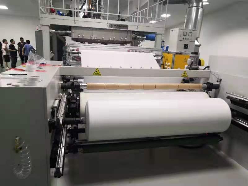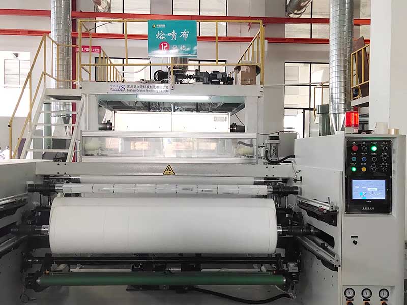 The melt-blown cloth production line automatically sucks polypropylene into the screw extruder through the vacuum feeding machine, and the extruder heats and melts the PP particles into liquid. The blower or air compressor sends the compressed air in the air tank into the air heating tank for heating. Hot air uses pressure to eject molten polypropylene material from the nozzle to form filaments (the nozzle contains hundreds of small holes), and then the ejected filaments reach the height of the screen machine, and then reach the winding equipment.