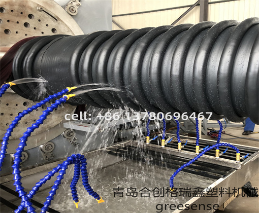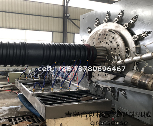 - HDPE continuous carat pipe production machine is made of high-density polyethylene resin (HDPE) as raw material, PP or PE corrugated pipe as auxiliary support pipe, and high-density polyethylene large-diameter winding reinforced pipe produced by hot winding molding process.