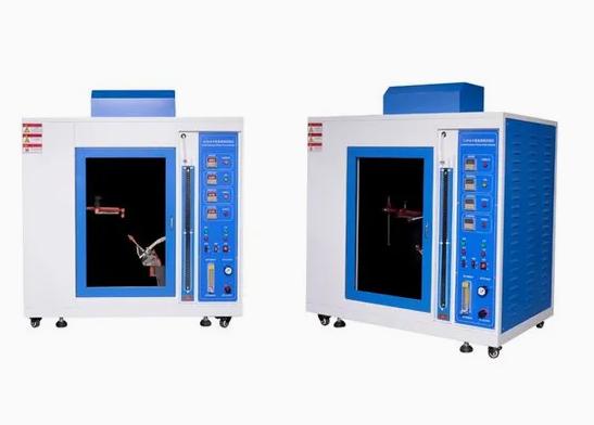 The machine consists of a combustion chamber with a burner at the bottom, a specimen holder, and a control panel. The specimen holder can be adjusted to hold the test material in a horizontal or vertical position, depending on the orientation of the material in the device being tested.
