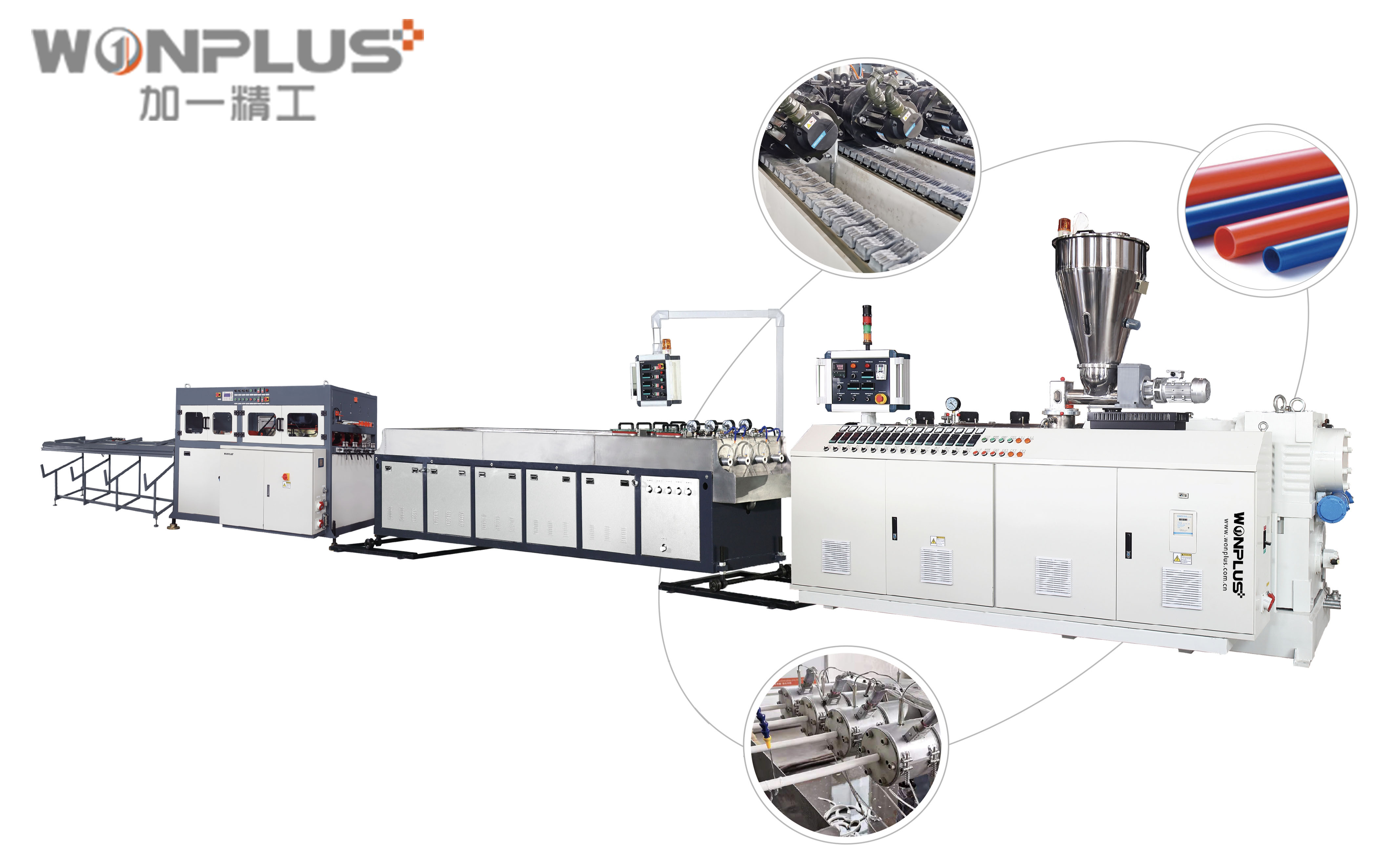 WONPLUS PVC four outlet pipe extrusion line has the model of 16-32mm four-outlet PVC pipe extrusion line and 32-63mm four outlet PVC pipe extrusion line, which can produce 4 pcs of PVC pipes simultaneously. The four outlet PVC pipe extrusion line has the advantages of highly efficient and high output.