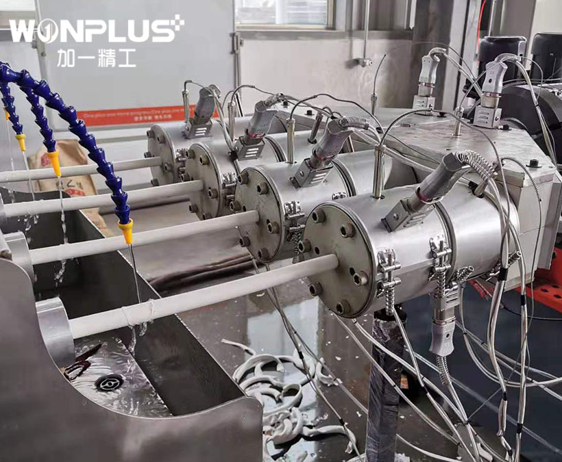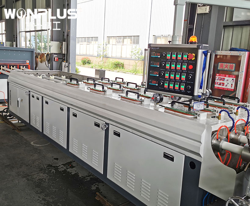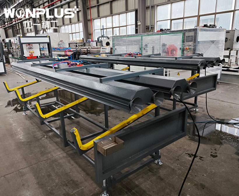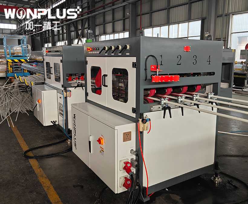 WONPLUS PVC four outlet pipe extrusion line has the model of 16-32mm four-outlet PVC pipe extrusion line and 32-63mm four outlet PVC pipe extrusion line, which can produce 4 pcs of PVC pipes simultaneously. The four outlet PVC pipe extrusion line has the advantages of highly efficient and high output.