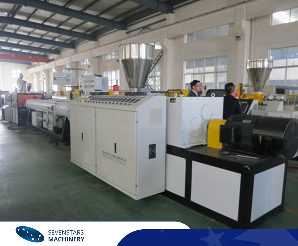 Ф20-Ф630,Ф 710-Ф1000 series PVC pipe extrusion line is mainly used in the manufacture of plastic PVC pipes with various diameters and wall thickness used in the industries such as agricultural and constructional plumbing, cable laying etc, this line is composed of conical twin screw extruder , vacuum calibration tank, haul-off, cutter and stake etc, the extruder and haul –off methods are two –claw, three-claw, for – claw, six-claw, eight –claw. Ten-claw, tweleve-claw etc, you may choose saw blade cutting type or planetary cutting type, it is additionally attached with length counter and intensifying device, this line with relable performance and high production efficiency, our company can also manufacture special pipe production lines, e.g. spiral silencing pipe and core foaming pipe according to your requirements.