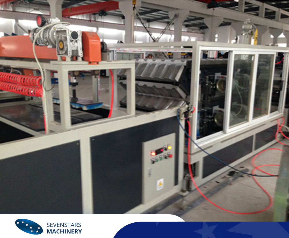 PVC, ASA or PMMA compound roof tile production line consist of conical double screw SJ80/156, Single screw co-extruder, extruding tool, forming machine of main tile and ridge tiles , haul-off , cutter, stacker,