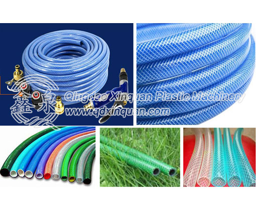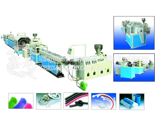PVC fiber-reinforced hose production line mainly consists of extruder, spray water cooling tank, haul-off unit, fiber coiling machine and winding machine. It is rational in configuration, unique in construction, reliable in performance, simple in operation, convenient for maintenance and high in continuous capability; and has been greatly accepted by the customers.