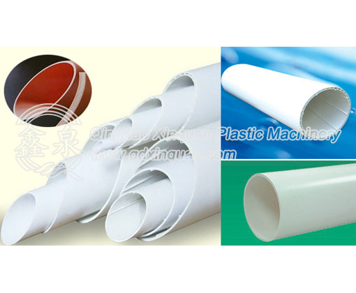 The production line is co-extrusion type adopting two twin conical screw extruders; we have developed the advanced technology and formula on the basis of years of experience and practice. The line uses special designed co-extrusion mould, if change the inner mould, it can produce solid pipe, solid spiral pipe, foamed pipe or foamed spiral pipe. When change the mould, the whole line can also produce the nanometer antibacterial PVC water supply pipe, hollow wall inside spiral pipe.