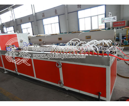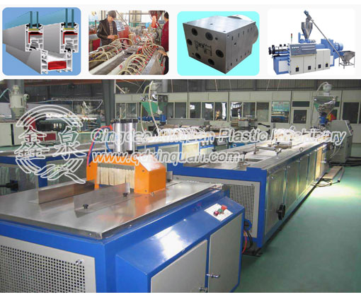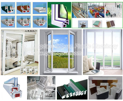 The PVC window and door profile production line uses PVC or UPVC as raw material to produce various kinds of profiles for windows, doors or decoration. The extruder haul-off adopts frequency inverter for speed control, the whole line can realize stepless speed regulation; the vacuum calibration stand uses water cycling type closed vacuum system, equipped with centralized water supply and quick-change coupler, realize fast and easy change the different models of calibration mould; the calibration stand length can be 4m, 6m or 8m; the haul-off adopts belt type, guarantees stable production and the profile do not get deformed; the automatic lamination device guarantees are smooth surface of profiles; the cutting machine is synchronous system, guarantees the cutting section is smooth and no split after cutting. The complete production is energy saving, stable performance, high efficiency. The profiles from this line have advantages of good looking, strong to bear compression, good light stability and thermo stability, age-resistance, etc.