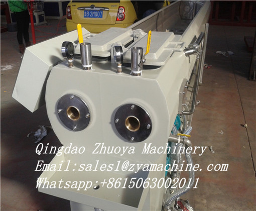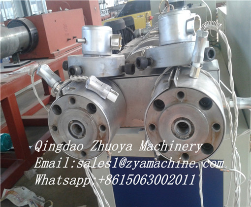 PVC double-pipe extrusion production line with conical twin-screw extruder as the host of different tube matching nose and the corresponding auxiliary mold formed, mainly for the production of pairs of root PVC pipe, mainly used in the production of PVC pipe to pipe , PVC pipes, electrical threading pipe. Make full use of production line extruder extrusion capacity, production of small diameter pipe can reach very high quality, high production efficiency, the use of safe and convenient.