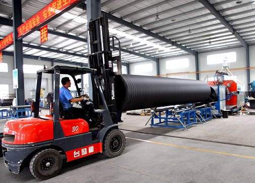 The production lines are shaped tube extruder, welding extruder, winding forming machine, cutting machine, and related auxiliary equipment, having a production capacity, high production efficiency, stable operation, pipe ring stiffness, unit weight per meter is small, excellent anti-creep performance, easy connection and construction and economic advantages.