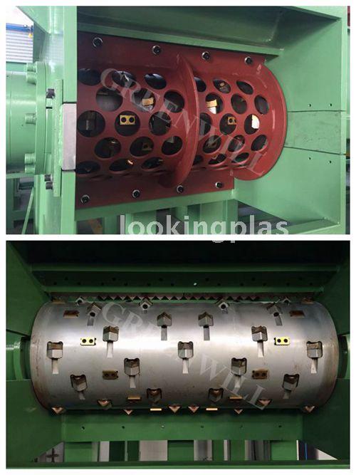 2. Features of pp pe film plastic shredder 1.Movable blade,dismounting convenience, easy for cleaning and maintenance. 2.Each rotary blade has four cutting edge, can be used again after rotating 90°. 3.Hvaing reducer with spindle,smooth operation, low noise, large rotating torque.4.PLC control system,positive and negative turn automatically,running machine more safety. 5. Backfire treament after weldinging tank, dissolve weld stress. 6.Blade position apply precision machining,making sure the same space between each rotary knife and fixed knife. 7.Rotary blade position adopts embedded with high strength screw connected to blade spindle, can prevent the phenomenon that welding blade drop by long-term quake..