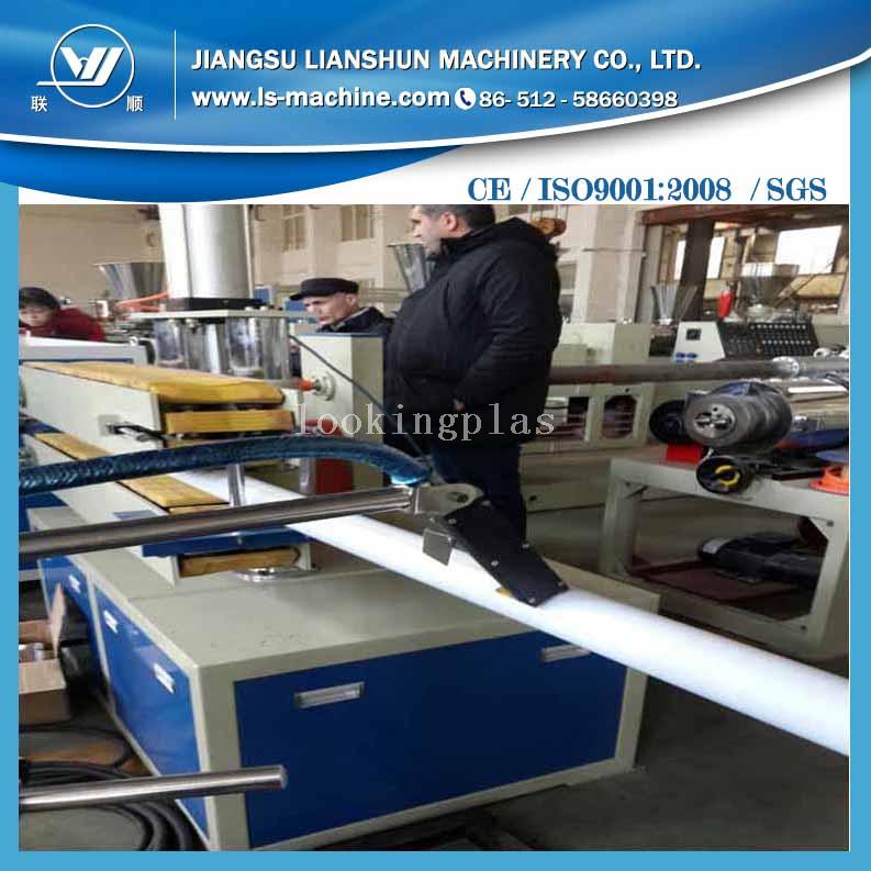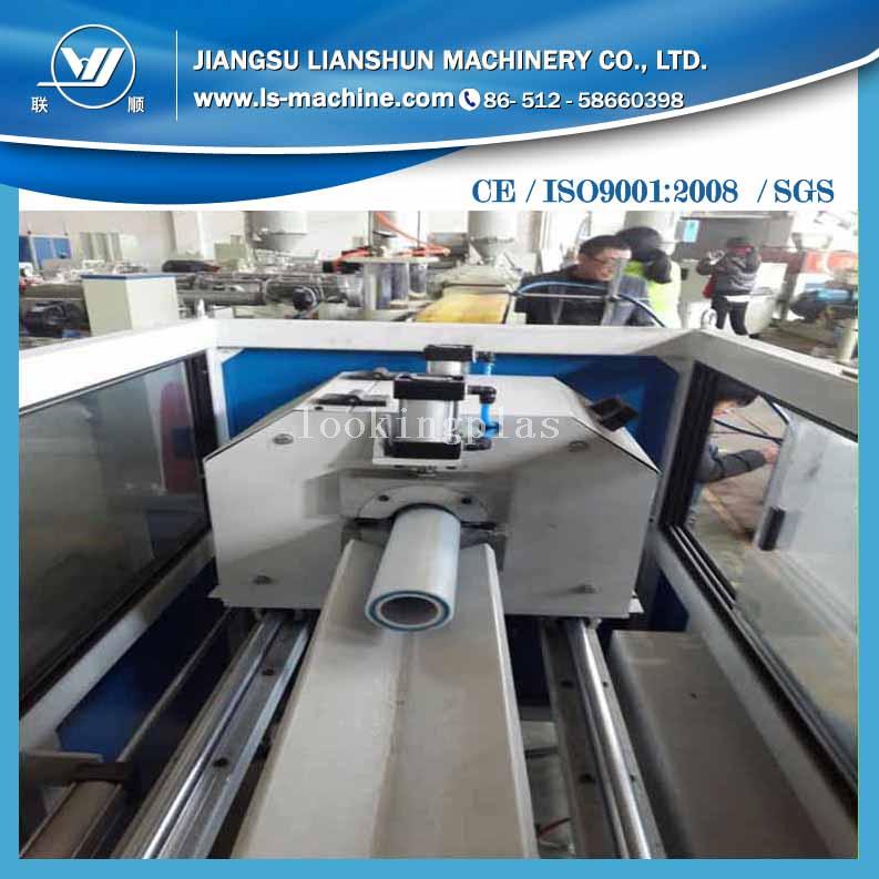 PPR pipe machine/plastic pipe machine is used to produce PPR pipes for cold and hot water supply in house. It's consisted of vacuum feeding machine, hopper dryer, single screw extruder, mould, mark line co-extruder, vacuum calibration and cooling tank, extended spraying cooling tank, haul off machine, printer, cutter and stack bracket. And for three layers PPR fiber reinforced pipe, there will be also another extruder for middle fiber layer.