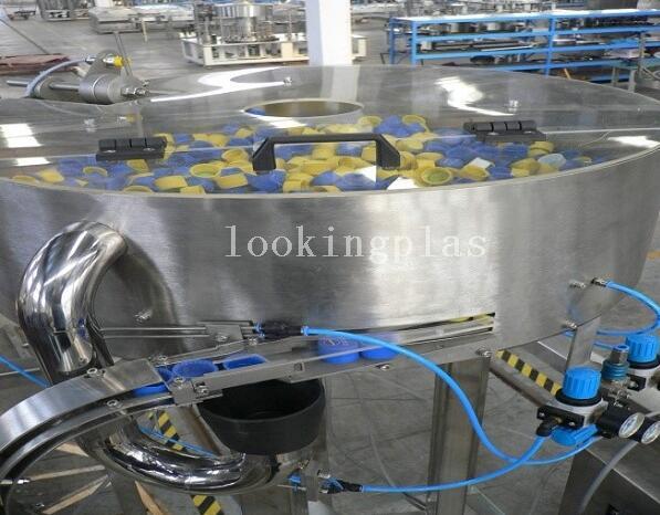 The capping rotates through reduction box drive rotational wheel, which make the cap leave the hopper with the function of centrifugal force. There is a separation device for right cap and reverse cap at the entrance, when the reverse cap passes, the cap automatically fall into and return to pipeline, and blow the reverse cap automatically to hopper through wind power. Only right cap could enter into skids smoothly, the volume of cap inside of hopper will be automatic inspected by electric switch to control cap conveyor, and that ensures best effect of cap down. When the right cap enters into the slide way, it could smoothly enter into cap feed plate, to prevent accidents, there is an anti reverse cap drive plate device to match with slide way, to ensure that the access to the cap feed plate is correct. The slide way is also equipped with a pair of photoelectric switch, when testing no cap, then an immediate halt to the host. In order to effectively remove non-anti-theft ring bad caps and cleanup additional caps in hopper, there is an active exit in front of the hopper exit can meet this function.