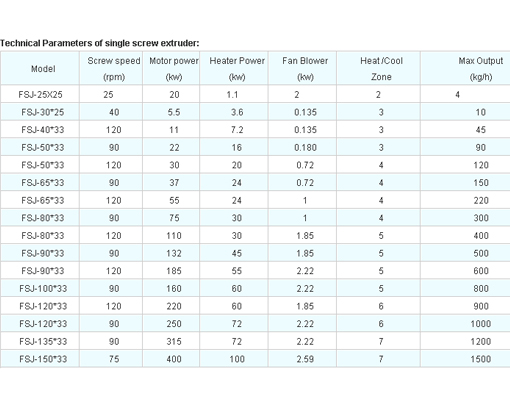 Model | Screw speed (rpm) | Motor power (kw) | Heater Power (kw) | Fan Blower (kw) | Heat /Cool Zone | Max Output (kg/h) |