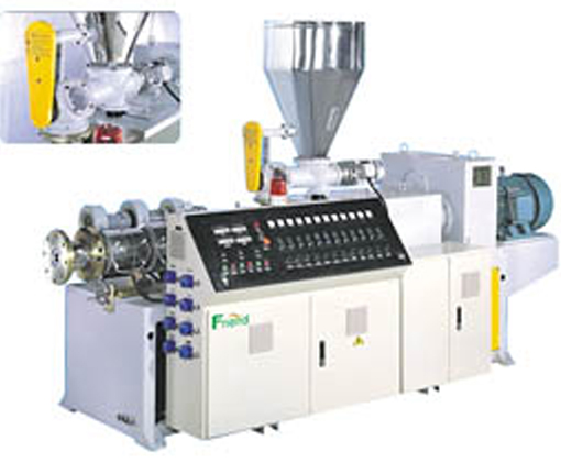 FSJSZ series conical twin screw extruder designed by Qingdao Friend Plastic Extrusion Technology Co.,Ltd., absorbing European expert’s design concept. Combined with auxiliary equipment, can directly use PVC powder to produce pipes, sheets, plates, profiles and other plastic products.