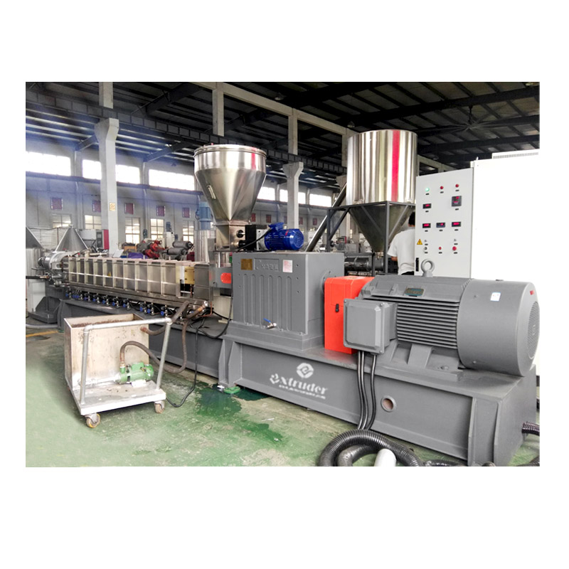Application: This twin screw extruder machine is designed for PP + CaCO3 (Calcium Carbonate) powder (high percentage of this powder or BaSO4 powder) added filler masterbatch, high screw speed, and high torque gearbox.